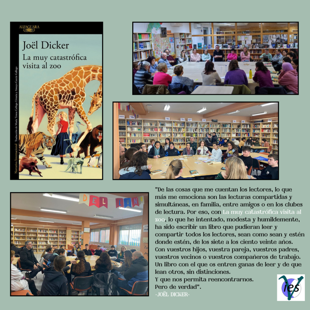 Este mes, nuestro Club de Lectura ha leído La muy catastrófica visita al zoo, del escritor suizo Jöel Dicker. El martes, comentamos este libro en la Biblioteca Municipal de Santa María, junto al club de lectura «Martes de Tertulia», en un coloquio intergeneracional. Y el miércoles hicimos nuestra tradicional quedada, en la biblioteca de nuestro instituto, y participó una veintena de personas -entre profesorado y alumnado-. Estamos muy contentos con la acogida, y en general, los participantes nos dijeron que este libro les había gustado mucho.